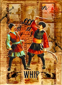 ![]() № 11 WHIP - PEITSCHE (RUTEN) Es gibt offensichtlich Reibung zwischen den beiden Männern im Mittelpunkt dieser Karte. Das rote Leuchten und die sich überlappenden Worte kennzeichnen ihre hitzige Diskussion, die Notenschrift in der Mitte die zunehmende Lautstärke, das Sforzando für den Peitschenknall, eine plötzliche kräftige Betonung. Diese verbale Auseinandersetzung ist nur ein Bruchteil von einer körperlichen Auseinandersetzung entfernt. Die beiden Hände am unteren Rand stehen für konträre Meinungen und gegenseitige Schuldzuweisungen. Die Peitsche ist nicht nur eine Karte von Konflikten, Wut und sogar Missbrauch, sondern auch von Leidenschaft und körperlicher Aktivität. Im Hintergrund sind Filmausschnitte turnender Frauen und zwei Gewichtheber, was allesamt auf wiederholte, sogar rhythmische Aktionen hindeutet. Schlüsselworte: Konflikt, Streit, Schlägereien, Missbrauch, körperliche Aktivität, Ärger, Sexualität. |