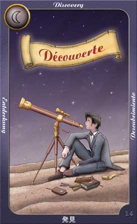 ![]() ENTDECKUNG Karte, die auf die Entdeckung neuer Elemente im Leben weist. Sie weist auf offene Gedanken hin, die Fähigkeit das in Frage zu stellen, was schon errungen ist. In dieser Hinsicht spiegelt diese Karte auch die Imagination wieder. Die Bücher, Manuskripte und Werkzeuge, die auf dem Tisch liegen, deuten auf die Suche sowohl nach theoretischem wie auch nach praktischem Wissen und Information auf dem Grundstück hin. Dies alles zeigt eine grosse Fähigkeit, Dinge zu erkennen / wahrzunehmen und eine gewisse Weisheit auf. Das Fernglas kann auch seinen Nachteil haben. Wenn man die Nase zu sehr darauf hat, kann es auch eine Scheuklappe werden und uns daran hindern, das zu sehen, was vor unserer Nase liegt. |